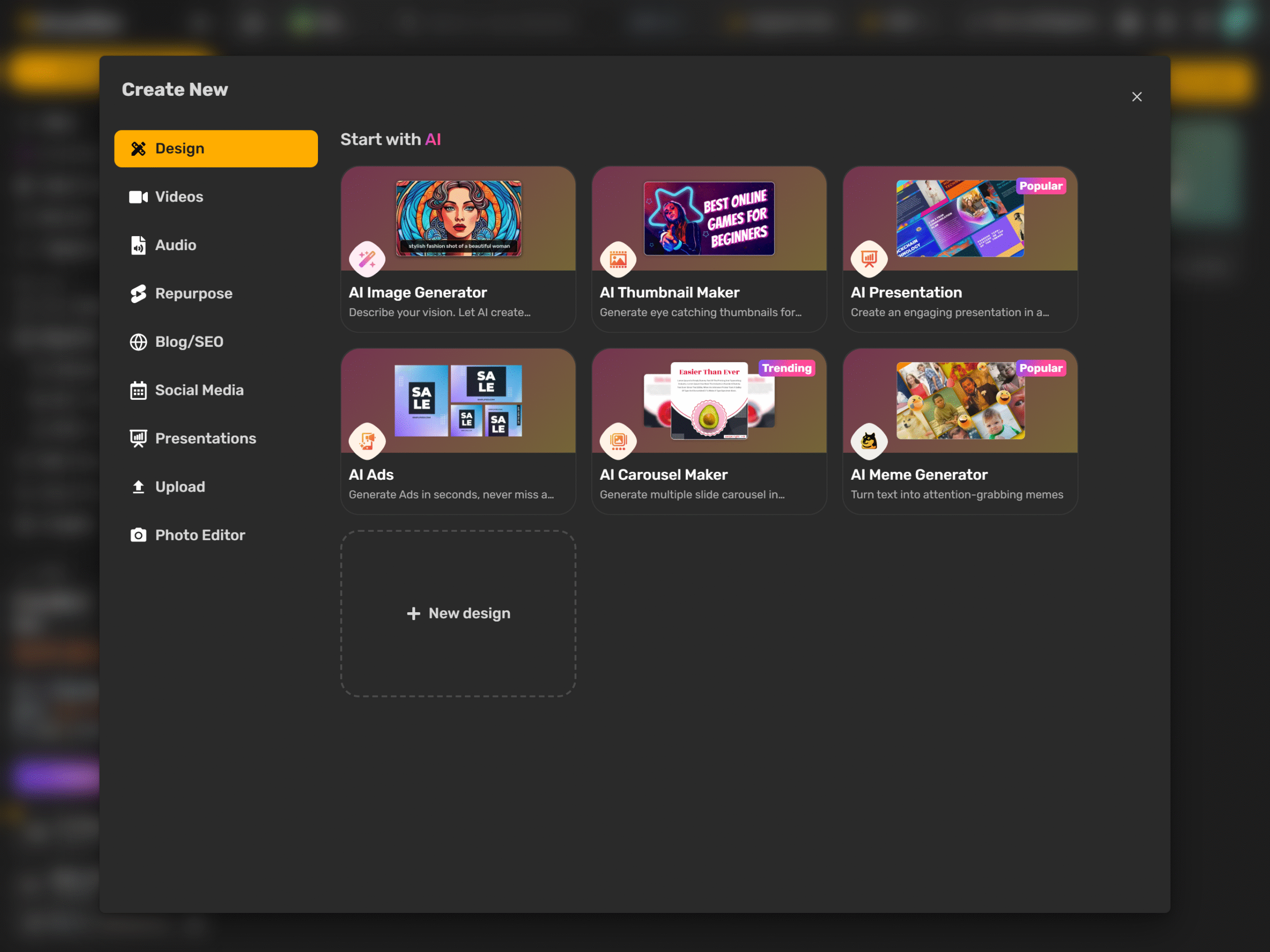 An AI design generator employs artificial intelligence to instantly generate graphics, layouts, or visuals based on either text prompts or pre-existing templates.