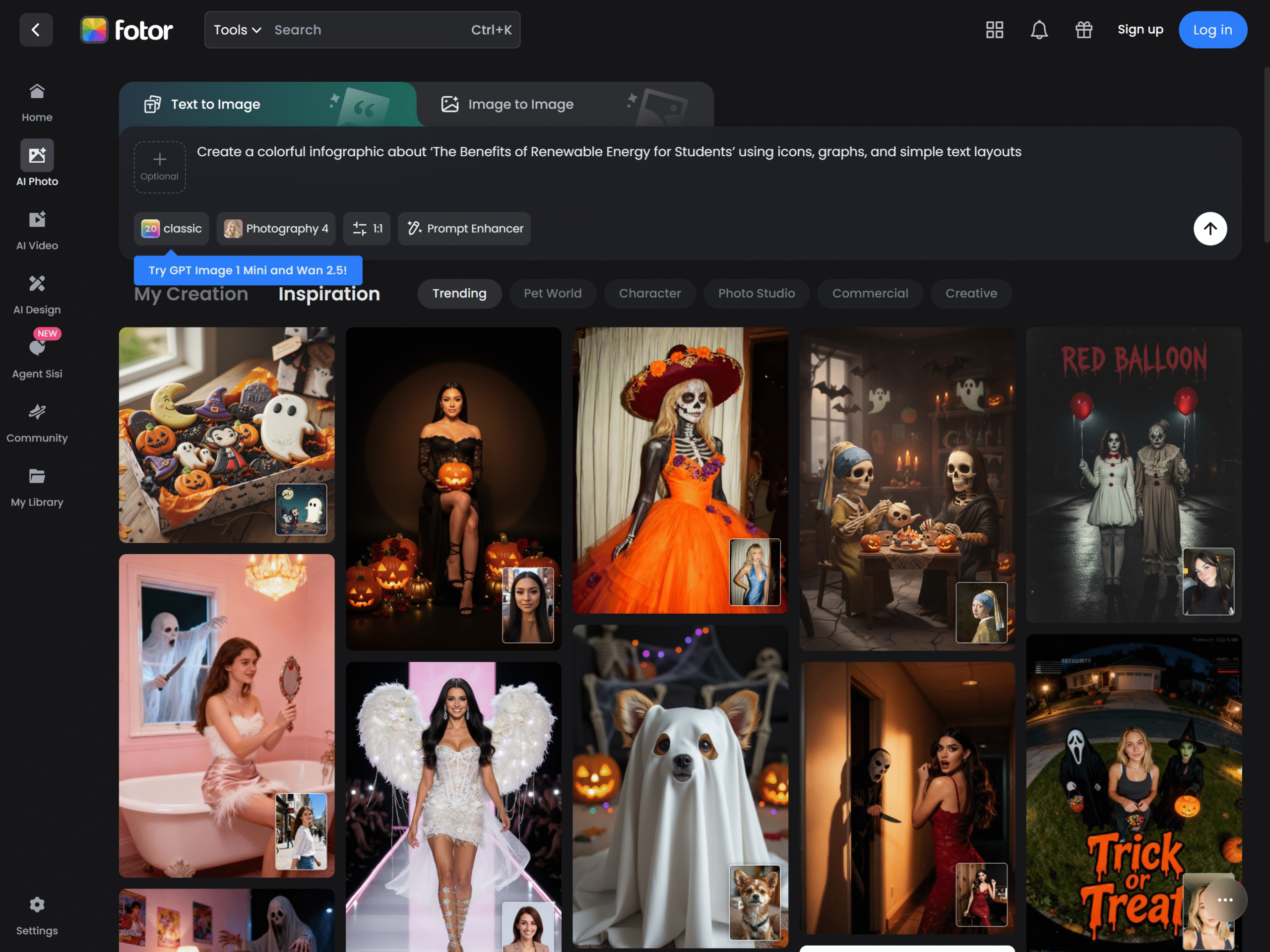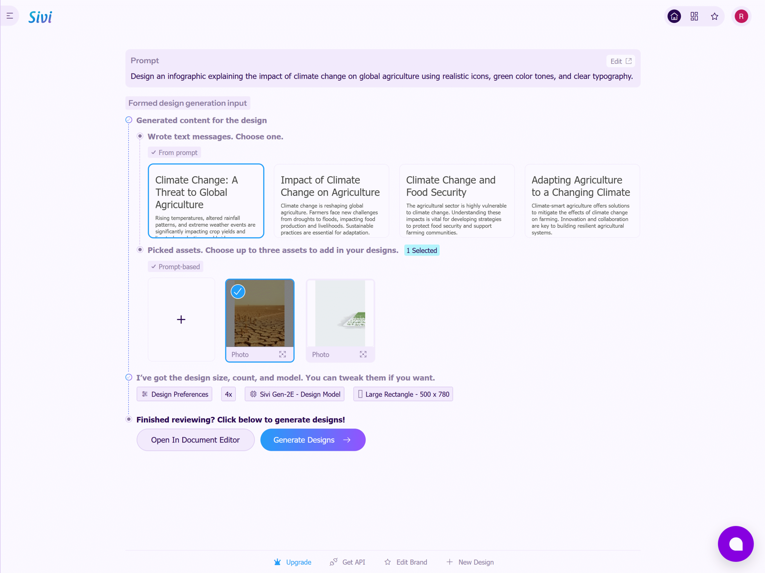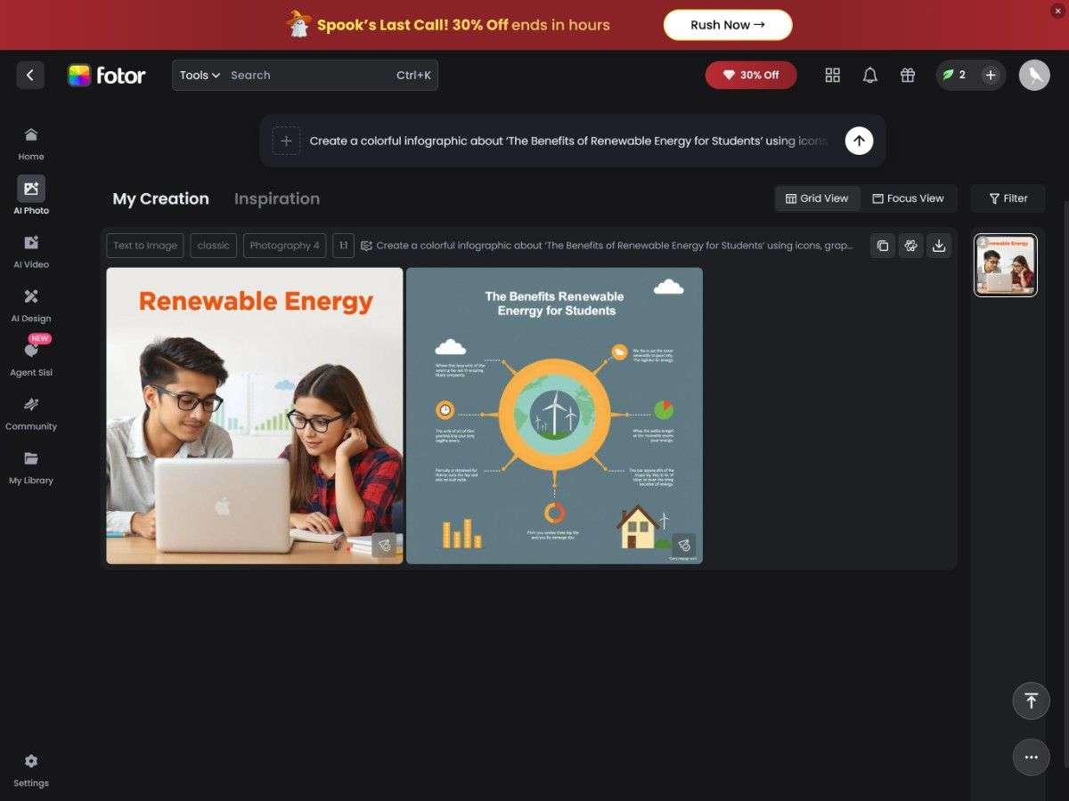 Fotor’s AI Designer is a comprehensive and free-to-use AI design generator that is a great assistant for both academic and artistic purposes. You have the option to give a text prompt like “poster on global warming,” and Fotor will very quickly create a design of high quality with images, icons, and text formatting.