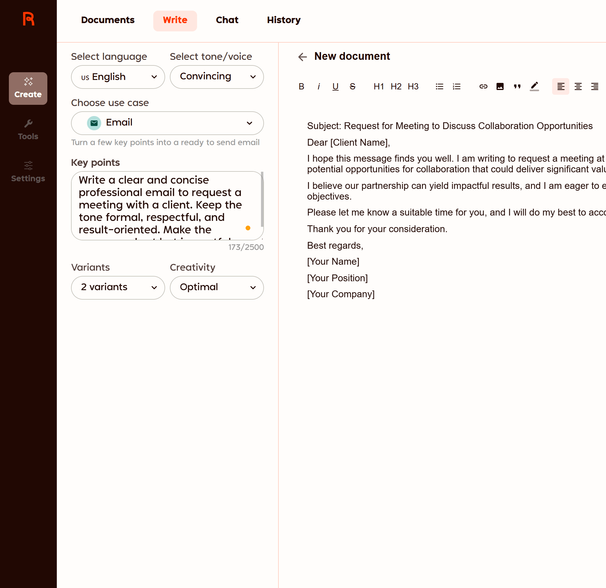 To give an example, the email writing AI tool can convert an unclear command like “remind my client” into a formatted, courteous, and polite reminder email that is full of details. Thus, every communication becomes refined according to the business standards.