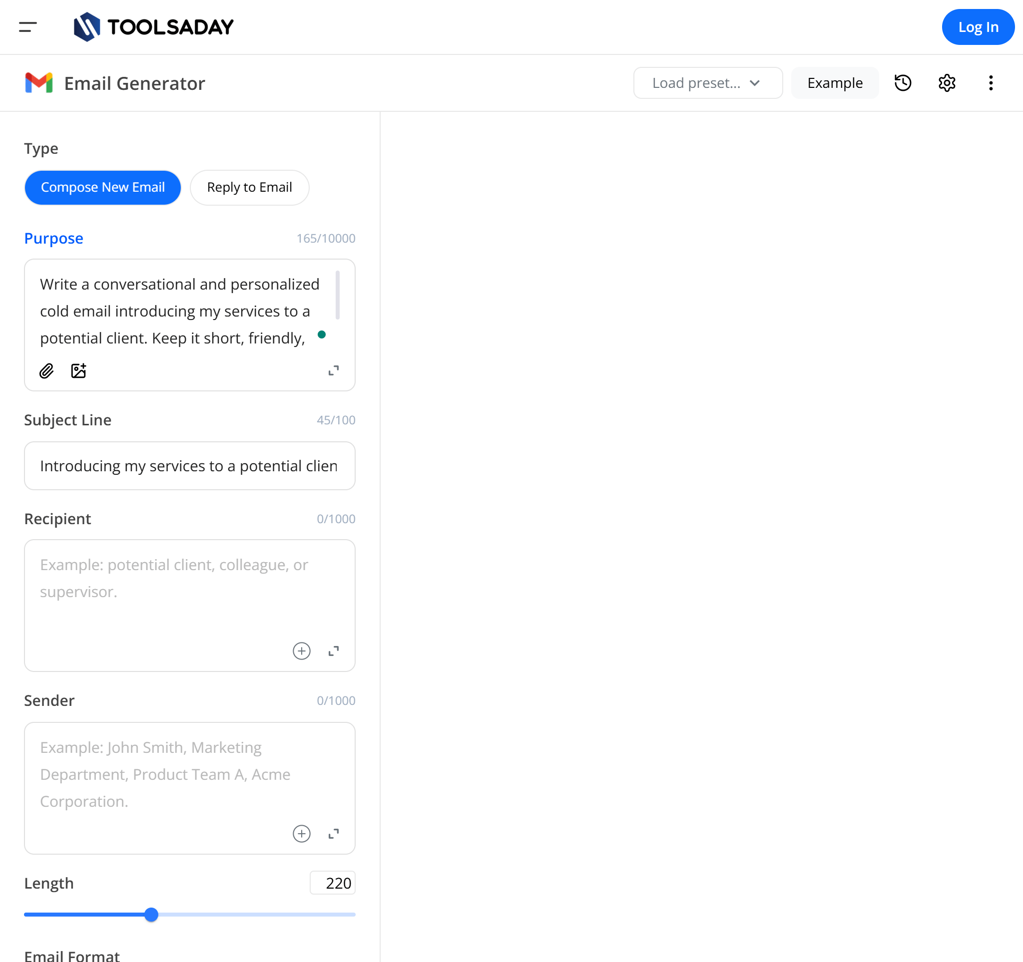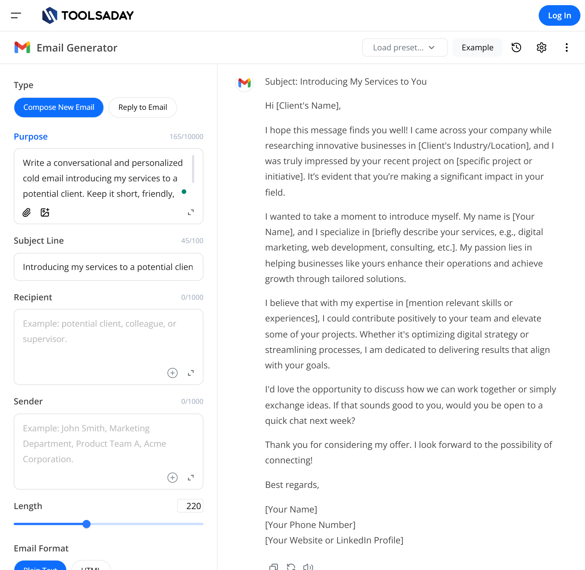 Concise writing, e.g., professional email-making, perfect structure, etc., is one of its good points. Toolsaday holds the front of clarity and professionalism while you are doing any kind of email writing, like follow-ups, meeting requests, job-related emails, or client communications. It can also help to rewrite existing texts into more polished and formal content, thus making it feel like a complete email writing AI assistant.