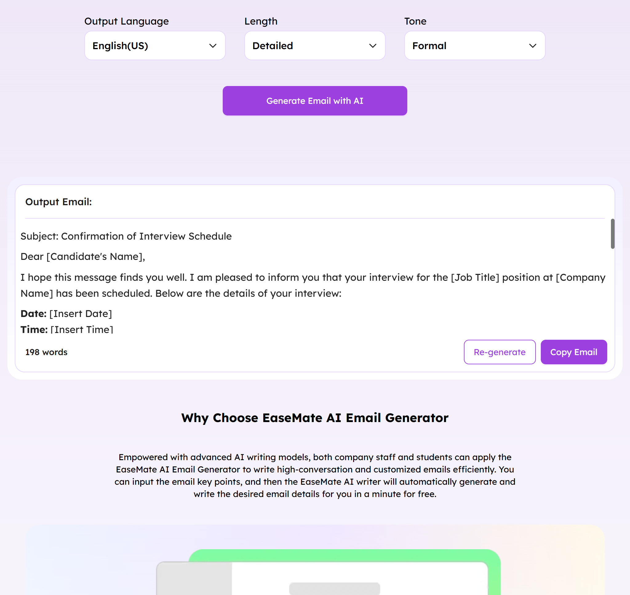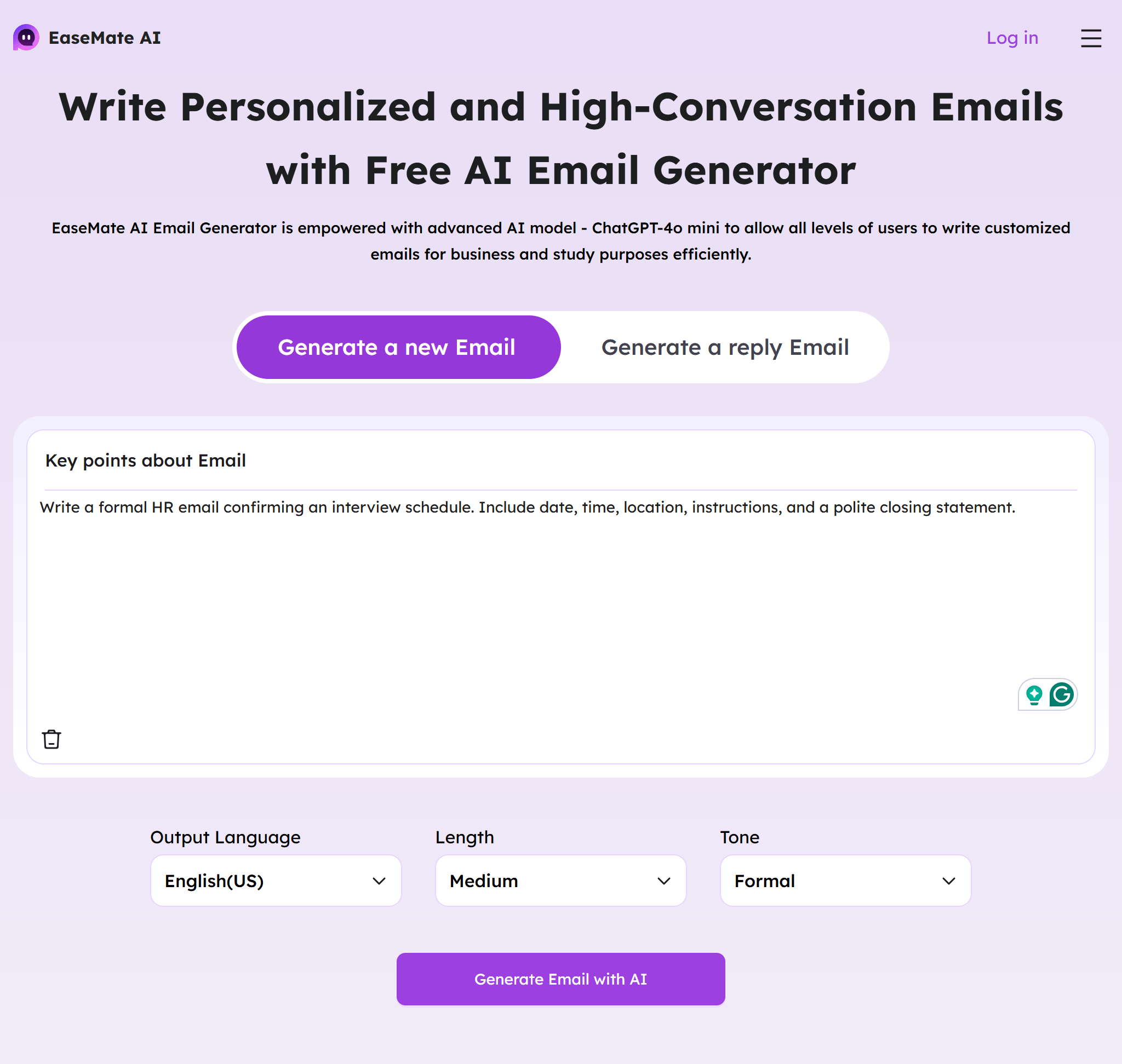 EaseMate is one of the strongest and most user-friendly platforms that can produce emails quickly and professionally. Being an AI email generator free solution, it provides a user-friendly interface that allows professionals to draft emails in seconds. You just put in a little information about your aim, and EaseMate produces polished, sendable drafts right away.